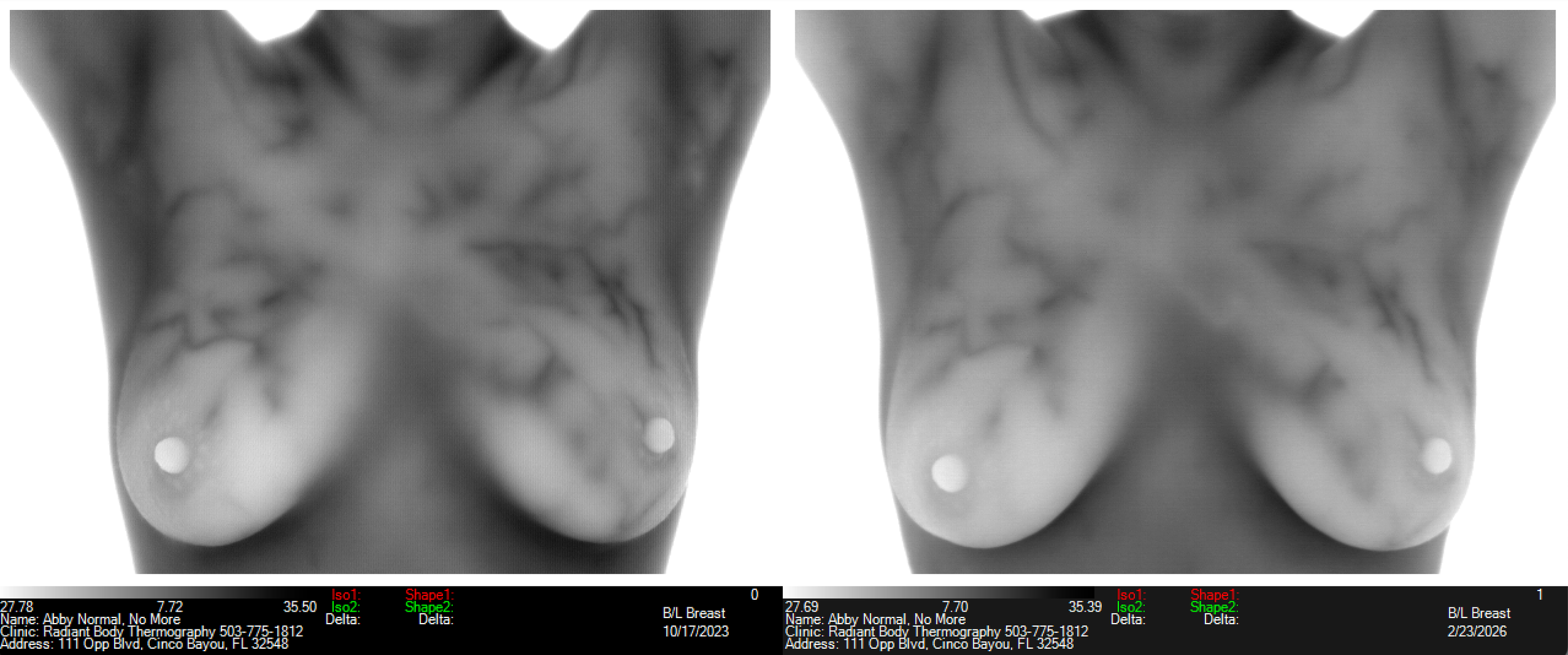 This client had an abnormal left breast for several years! All images of left breast below are “abnormal” (TH4) except the ones on the far right of each group with date of Feb 2026. It wasn’t getting worse but wasn’t getting better either, plus she had had the pattern suggesting estrogen dominance for all those years too, going back to 2018!